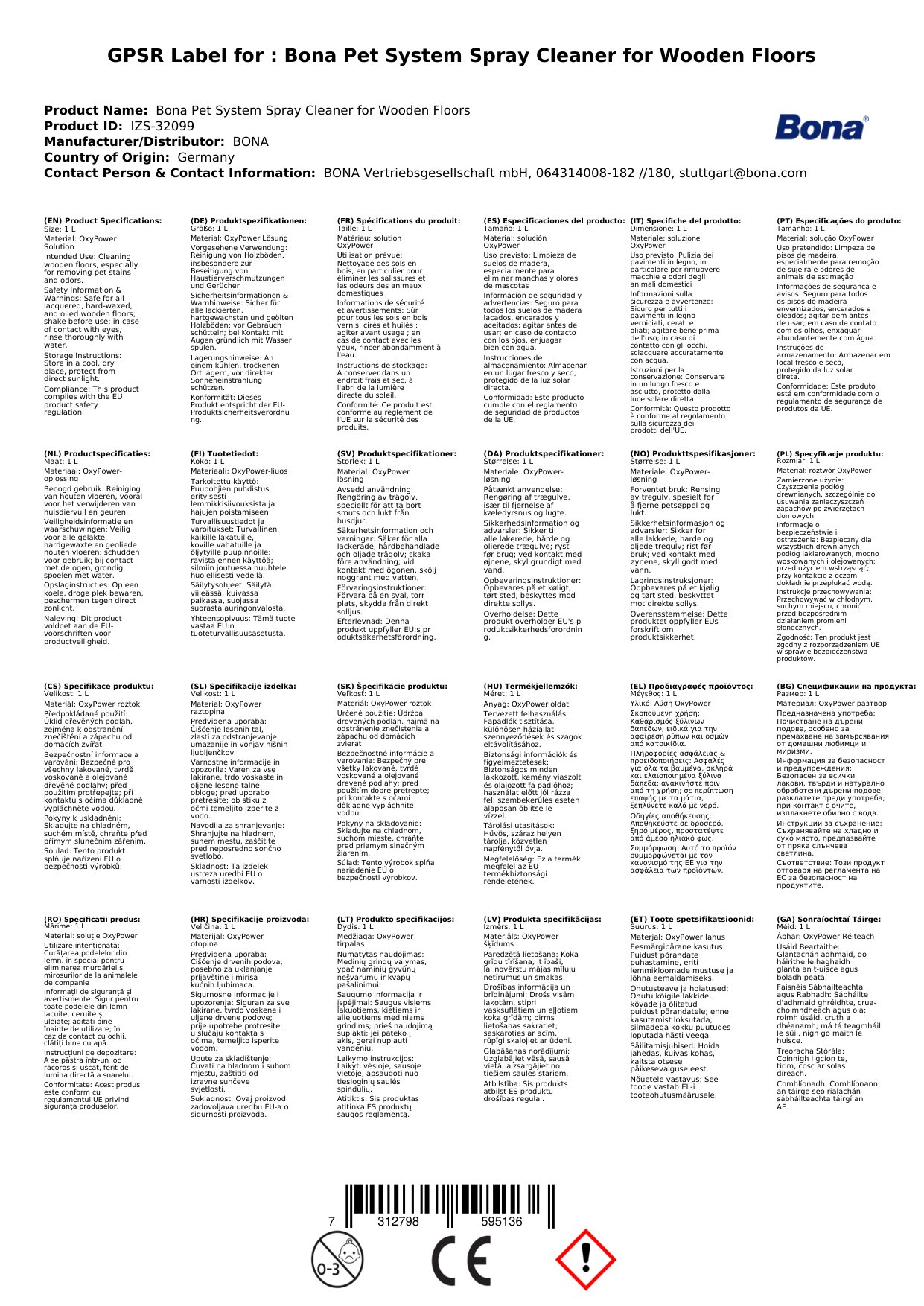 Tá Spraeire Glantacháin Bona Pet System deartha go speisialta chun urlár adhmaid a ghlanadh go héifeachtach. Tá sé sábháilte do pheataí agus do theaghlaigh, ag cinntiú go bhfuil an timpeallacht glan agus sláintiúil. Tá an spraeire seo furasta le húsáid, rud a fhágann go bhfuil sé foirfe do gach duine. Is féidir leat a bheith cinnte go mbeidh do urlár glan agus saor ó smál tar éis duit an táirge seo a úsáid.